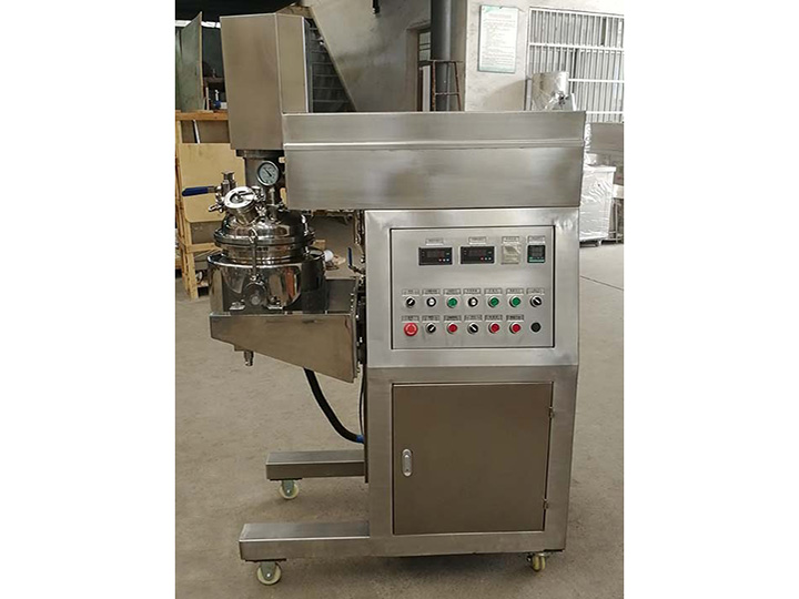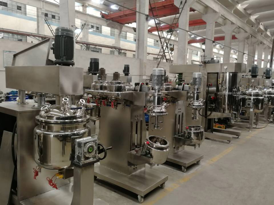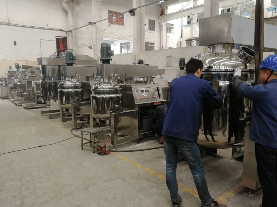 物料在水鍋、油鍋內(nèi)通過加熱、攪拌進(jìn)行混合反應(yīng)后,由真空泵吸入乳化鍋,通過乳化鍋內(nèi)上部的中心攪拌、聚四氟乙烯刮板始終迎合攪拌鍋形體,掃凈掛壁粘料,使被刮取的物料不斷產(chǎn)生新界面,再經(jīng)過葉片的剪斷、壓縮、折疊,使其攪拌、混合而向下流往鍋體下方的均質(zhì)器處,物料再通過高速旋轉(zhuǎn)的切割輪與固定的切割套之間所產(chǎn)生的強(qiáng)力的剪斷、沖擊、亂流等過程,物料在剪切縫中被切割,迅速破碎成200um-0.2um的微粒,由于乳化鍋內(nèi)處于真空狀態(tài),物料在攪拌過程中產(chǎn)生的氣泡被及時(shí)抽走。采用抽真空的方式,使所生產(chǎn)的制品在攪拌過程中不再混入氣泡,從而保證可制造出富有光澤、細(xì)膩及延展性良好的產(chǎn)品。