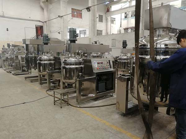 物料在水鍋、油鍋內(nèi)通過(guò)加熱、攪拌進(jìn)行混合反應(yīng)后,由真空泵吸入乳化鍋,通過(guò)乳化鍋內(nèi)上部的中心攪拌、聚四氟乙烯刮板始終迎合攪拌鍋形體,掃凈掛壁粘料,使被刮取的物料不斷產(chǎn)生新界面,再經(jīng)過(guò)葉片的剪斷、壓縮、折疊,使其攪拌、混合而向下流往鍋體下方的均質(zhì)器處,物料再通過(guò)高速旋轉(zhuǎn)的切割輪與固定的切割套之間所產(chǎn)生的強(qiáng)力的剪斷、沖擊、亂流等過(guò)程,物料在剪切縫中被切割,迅速破碎成200um-0.2um的微粒,由于乳化鍋內(nèi)處于真空狀態(tài),物料在攪拌過(guò)程中產(chǎn)生的氣泡被及時(shí)抽走。采用抽真空的方式,使所生產(chǎn)的制品在攪拌過(guò)程中不再混入氣泡,從而保證可制造出富有光澤、細(xì)膩及延展性良好的產(chǎn)品。